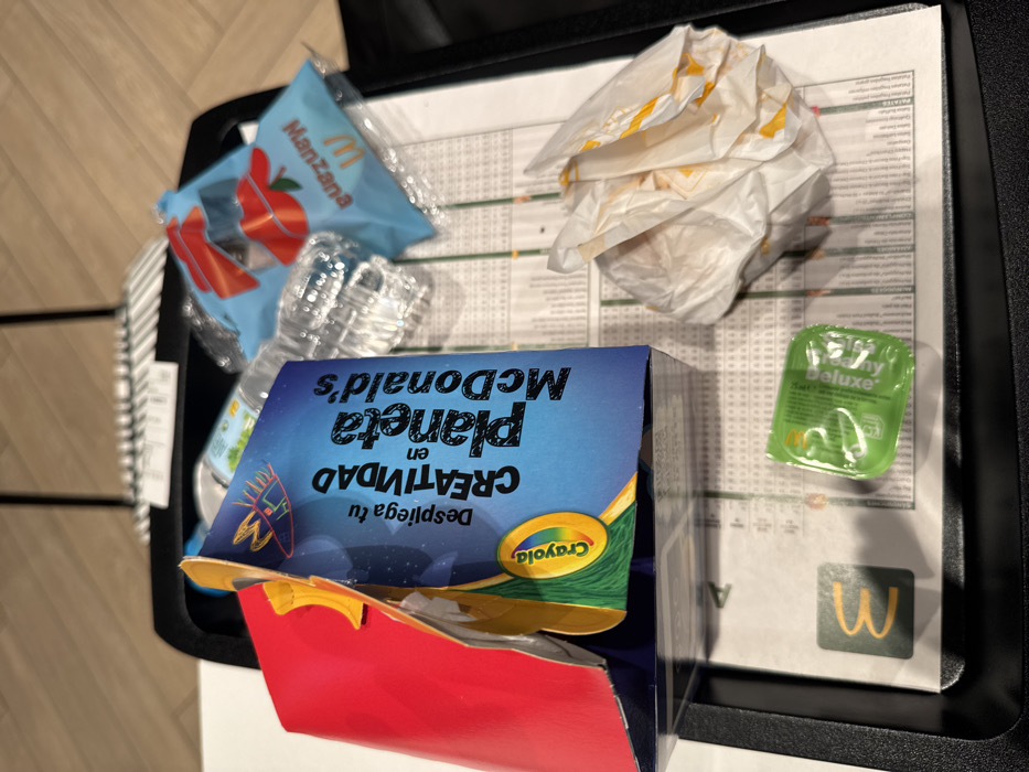 A McDonald's meal tray contains remnants of a meal. Visible are a blue "Manzana" bag, a water bottle, a crumpled paper wrapper, a small green "Honey Deluxe" sauce packet, and a partially opened McDonald's Happy Meal box with Spanish text "Despliega tu CREATIVIDAD en Planeta McDonald's." The tray has a white paper liner with printed numbers and the McDonald's logo.