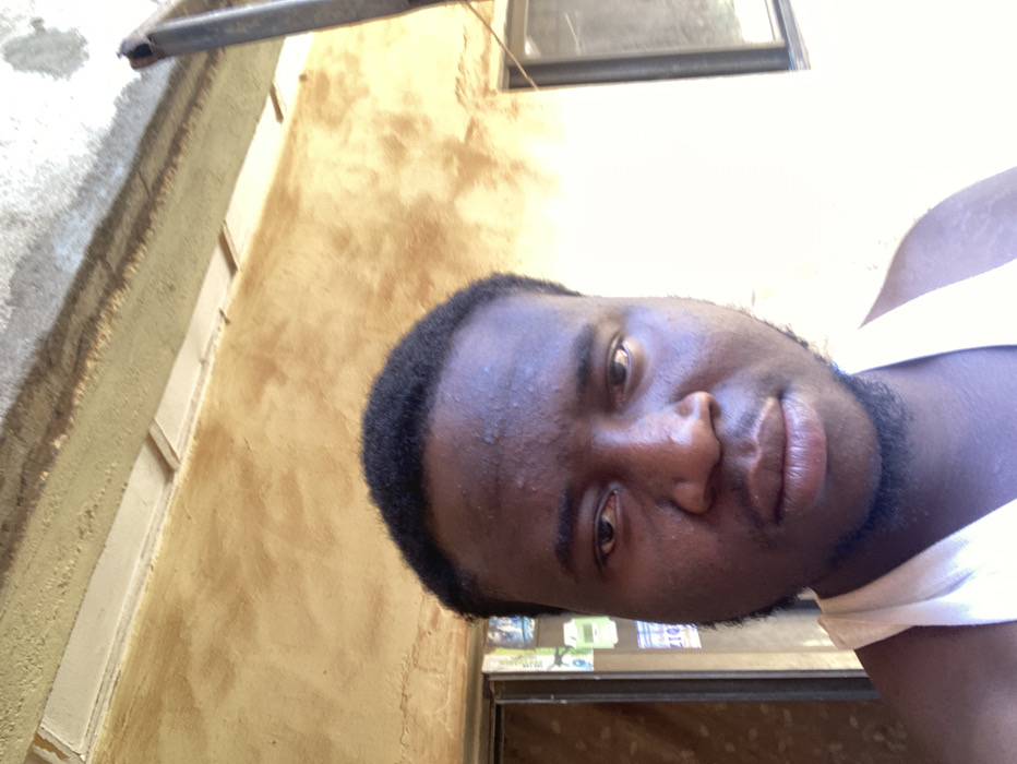 The image depicts a close-up, frontal portrait of an adult male in Yelwa, Nigeria