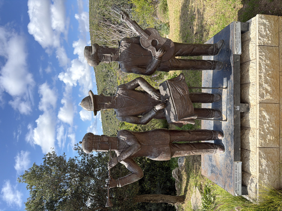 The image displays an outdoor sculpture titled "THE THREE ANGELS OF MUSIC" by Benjamin Levy, located in the Hof HaCarmel Regional Council, Israel