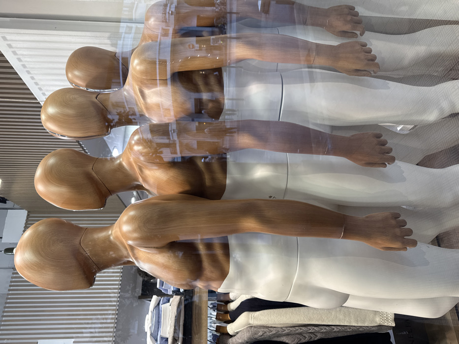 Four wooden mannequins are aligned vertically, viewed through a glass window. Each has a smooth, oval-shaped head, defined shoulders, and arms with realistic hand detailing. They are uniformly light brown in color. The torsos transition into white lower halves, partially obscuring a shelf filled with folded shirts and sweaters in various colors. Reflections are visible on the glass surface.
