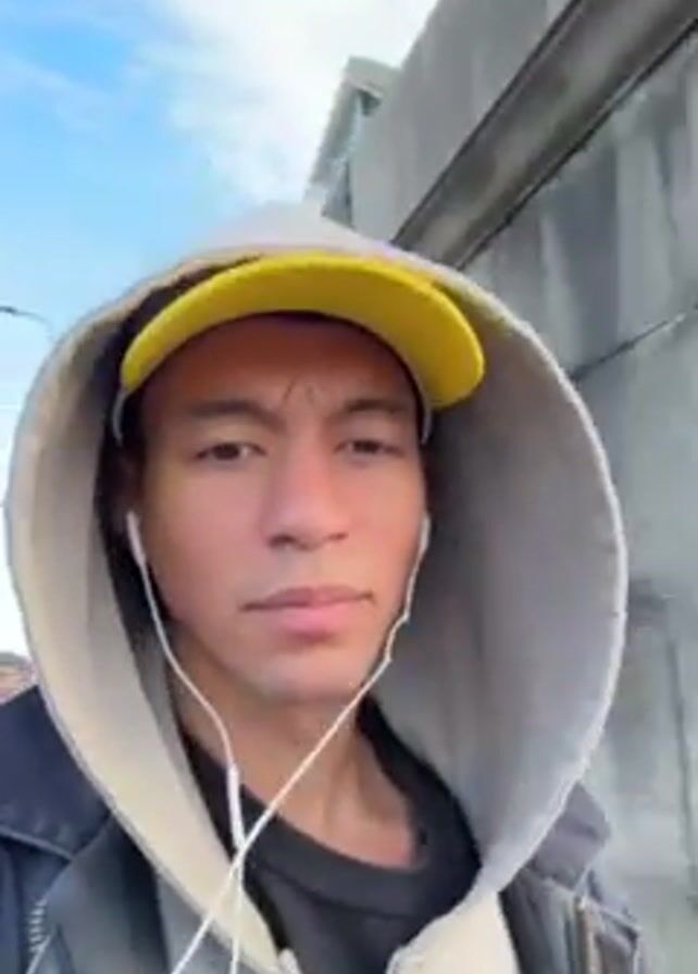 A young man with light skin is walking across a bridge. He is wearing a grey hooded sweatshirt, a yellow baseball cap, a black jacket, and white earbuds. The background shows a river and buildings under a cloudy sky. The bridge has red railings. The man appears to be filming himself.