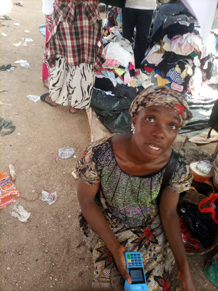 This image depicts an outdoor market scene in Zango-ndaji, Nigeria. In the foreground, a dark-skinned woman, positioned slightly left of center, is shown from the waist up, looking directly upwards towards the viewer with an open-mouthed expression. She wears a patterned headwrap, a dark-colored dress with a sequined or iridescent bodice, and a patterned skirt featuring brown, black, white, and red motifs. Small, light-colored earrings are visible on her ears. She holds a light blue portable electronic payment terminal (POS device) in her left hand, which displays a keypad with colored buttons and a screen. The ground is a sandy, light brown dirt surface, strewn with various pieces of litter including crumpled plastic wrappers, a red and orange "DE GLORY" branded wrapper, and small pieces of white and clear plastic. In the mid-ground and background, other individuals are partially visible. To the left, the lower half of a person is seen wearing a red and white plaid top, white trousers with black abstract patterns, and dark flip-flops. Behind the foreground woman and to her right, several large, haphazard piles of assorted used clothing, including shirts, trousers, and undergarments of various colors, are stacked on a dark-colored tarp or ground covering, indicating a retail stall. Further back, another person's lower legs in dark trousers are partially visible amidst more clothing piles. To the immediate right of the foreground woman, some small market goods in woven baskets and a round, silver-colored item are partially visible.