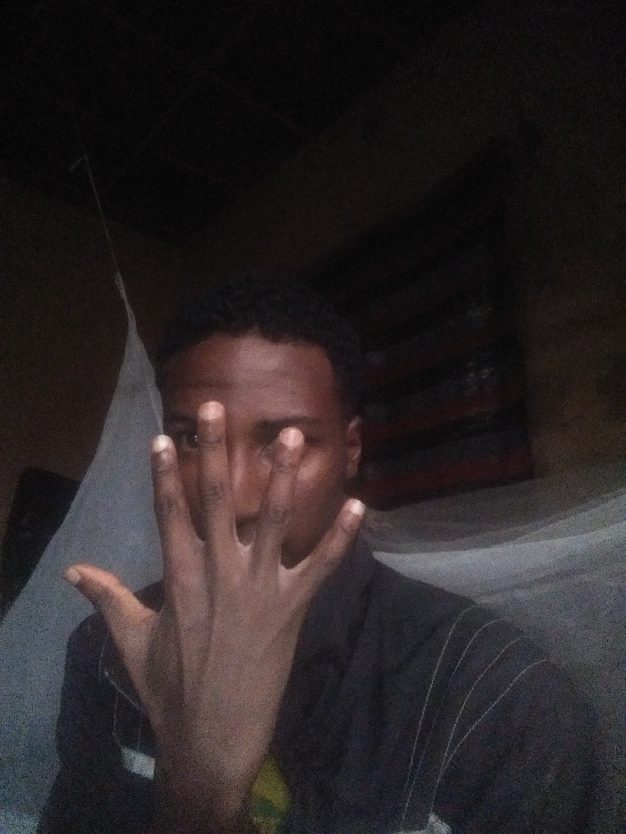 A person with short, dark hair is partially obscured by their own hand, which is held up to the camera. They are wearing a dark shirt and are positioned in what appears to be a dimly lit room, possibly a bedroom. A white mosquito net is visible in the background. The scene has low lighting, making the details difficult to discern. The person's face is partially hidden, and only one eye is visible.