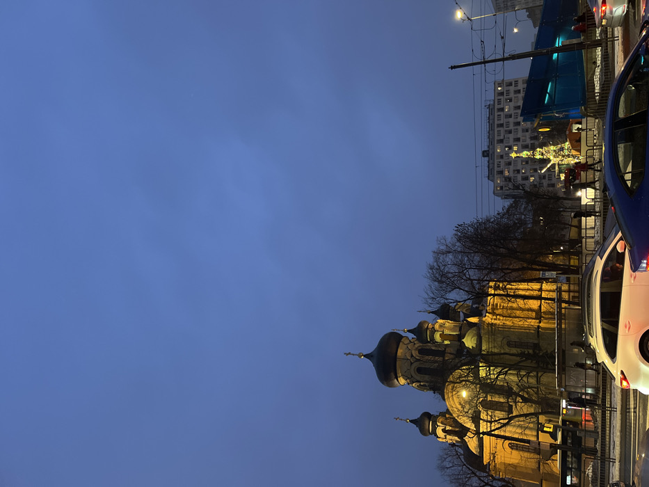 - "nighttime view of a golden-lit Eastern Orthodox church with dark domes, observed from a street with cars and pedestrians" by FM-AA15p2, licensed under CC BY 4.0