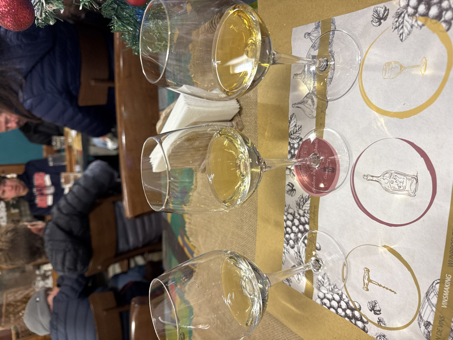 Three wine glasses sit on a table covered with a decorative paper. The glasses contain varying amounts of light-colored liquid, likely white wine. Each glass is positioned over a design on the paper: a sketched wine glass, a sketched wine bottle, and a sketched corkscrew within colored circles. A stack of napkins is visible behind the glasses. People are seated at the table, engaged in conversation. A Christmas decoration is partially visible in the upper left corner.