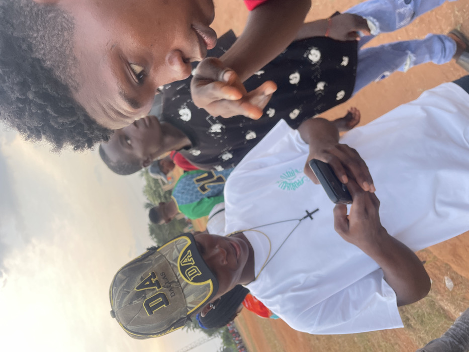 A group of young men pose for a selfie outside. The person in the foreground wears a "Dallas" hat and a white t-shirt with a cross necklace. They hold a small black electronic device, perhaps a phone. Another man wears a black shirt with white patterns and makes a hand gesture. Several others appear in the background, wearing various colored shirts. The sky is overcast.