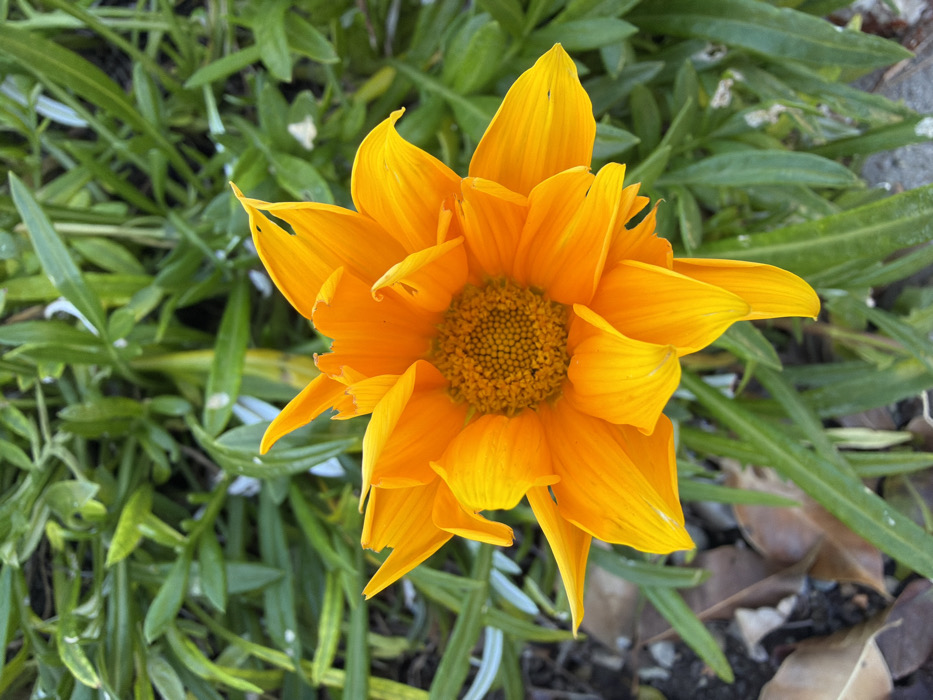 An eye-level close-up shows a vibrant orange gazania flower in full bloom. The petals are layered and slightly ruffled, radiating outwards from a dark center. The flower is set against a background of lush green foliage with slender leaves. Some dried leaves are scattered around the base.