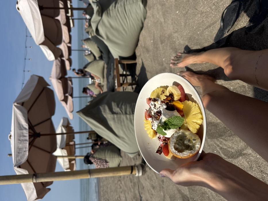 A person holds a bowl of fruit salad on a beach. The salad includes pineapple, banana, watermelon, mango, and a passionfruit. The bowl also contains granola and mint. In the background are beach umbrellas, lounge chairs, and other people relaxing. Feet are visible on the sandy beach.