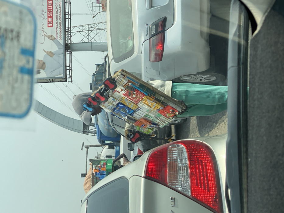 The scene depicts a street in Jakande, Nigeria, characterized by heavy daytime traffic