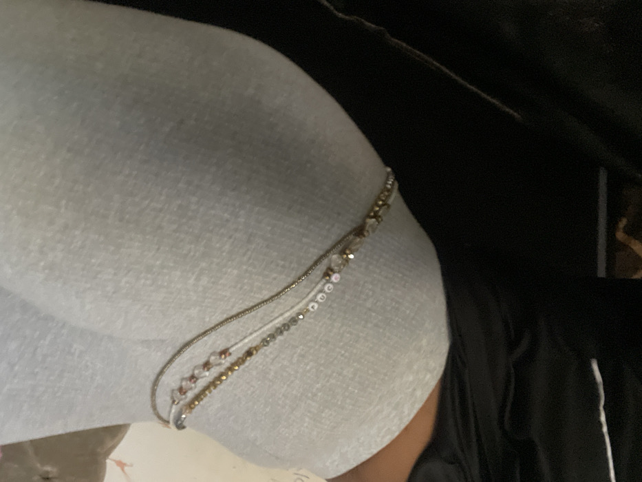 The image depicts a close-up, angled view of a person's left upper thigh and hip area, positioned in Ajaokuta, Nigeria. The individual wears light gray, possibly ribbed, fitted leggings. Multiple strands of decorative waist beads are visible around the hip/upper thigh. These include a thin gold-toned chain, a strand with small faceted clear or pinkish beads, a strand of small gold-colored cylindrical beads, and possibly another strand of smaller white or silver-toned beads. The beads are layered. The person's skin tone appears dark in the exposed area where the leggings and beads meet. The background is largely dark and out of focus, showing indistinct dark fabric or upholstery in the upper left and center, and a faint, light-colored, blurry object or surface with minor markings in the lower right. No specific actions or interactions are discernible beyond the pose of the individual, who appears to be seated or reclining.