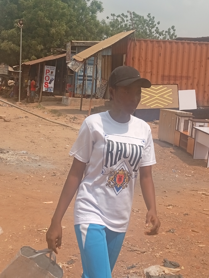 A person in a black cap, white t-shirt with a logo, and blue track pants walks on a dusty, barren landscape. The person carries a grey bucket. Behind, a ramshackle structure with a POS sign and an orange metal container are visible. Finished furniture pieces lean against the container. A sunny day casts stark shadows on the scene.