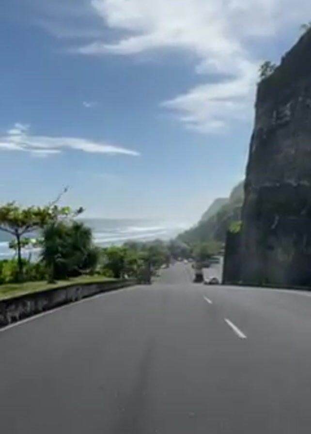 n asphalt road leading downhill towards the ocean. The road has a white line in the middle. On the right side of the road is a large, rocky cliff covered with vegetation. On the left side of the road is a low retaining wall and a grassy area with trees and bushes. In the distance, the ocean can be seen with waves breaking on the shore. The sky is blue with scattered clouds. There is a car further down the road. The camera is in a vehicle moving down the road.