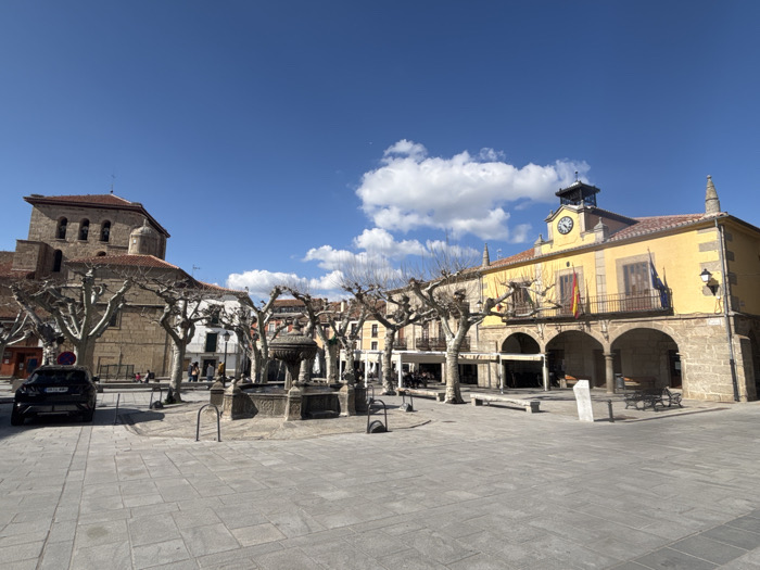 The image depicts the Plaza de España in Piedrahíta, Spain, under clear blue skies with scattered white cumulus clouds