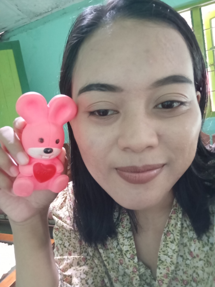 An adult female is depicted indoors in a close-up, frontal shot, presumably in Kecamatan Pati, Indonesia. She has dark, shoulder-length hair and is wearing a light-colored garment with a floral pattern. Her face is made up, featuring defined eyebrows and neutral-toned lipstick, and she displays a slight, closed-lip smile while looking towards the camera. In her left hand, she holds a pink, soft plastic or rubber toy resembling a mouse or rabbit, featuring white facial details, visible teeth, and a red heart emblem on its chest. The background consists of a light teal wall, with a green-framed window visible on the right side, suggesting natural light. A dark wooden surface is partially visible in the bottom left corner.