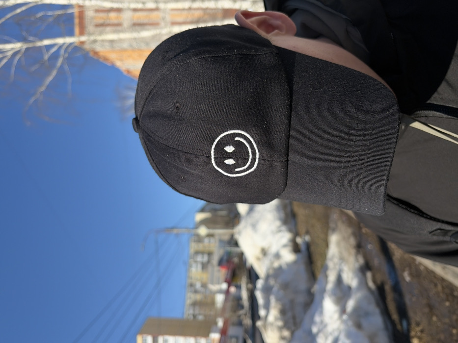 The image displays the right profile of an individual wearing a black baseball cap with a white embroidered smiley face outline on its front panel