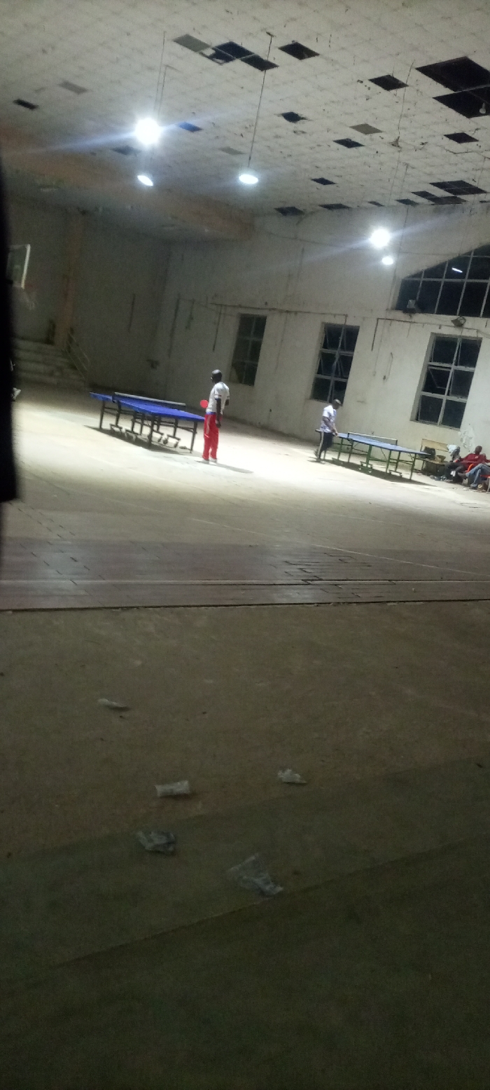 The image depicts an indoor recreation space, likely a gymnasium, with a high ceiling and numerous overhead lights. Several individuals are playing table tennis on multiple tables. Some people are seated in the background. Debris is scattered on the floor, contributing to a somewhat neglected appearance. Windows are visible at the far end of the room, and the ceiling shows signs of disrepair.