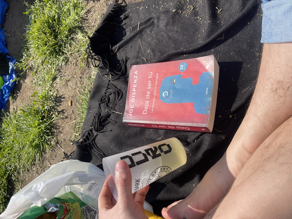 An individual is observed outdoors in Terrassa, Spain, on a sunny day. The scene focuses on a black fringed blanket laid on dry earth with patches of green grass. A person's right hand holds a translucent plastic cup, approximately half-full with a light yellow liquid. The cup is branded with "SARK SPIRIT OF NATURE" and "URZO" in black lettering. To the right of the cup, resting on the blanket, is a red-covered paperback book titled "JOE DISPENZA Deja de ser tú," with the subtitle "La mente crea la realidad" and a blue stylized head icon with "RESET" and "38ª edición." The lower bare legs and feet of the person are visible, resting on the blanket, with a small dark mark present on the left foot. The person is wearing light-colored shorts, partially visible at the bottom right. A white plastic bag, containing what appears to be snacks, is positioned in the upper left of the frame.