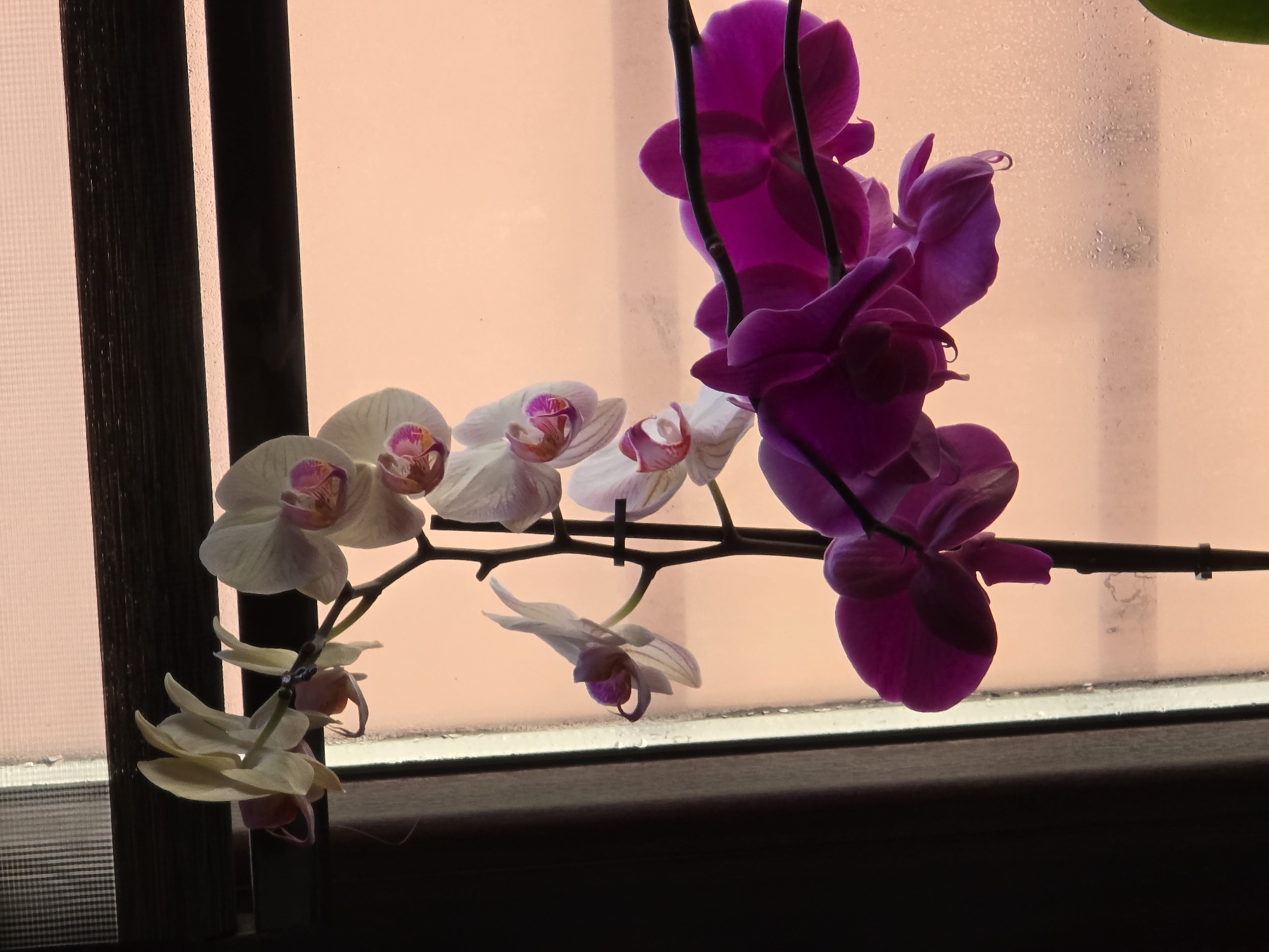 The scene depicts an orchid plant (likely Phalaenopsis) situated indoors in front of a window. The plant displays two primary flower stalks. The upper stalk bears several flowers with white to light cream petals and prominent pink-magenta centers. The lower stalk features a cluster of deep magenta-purple flowers. Multiple water droplets are visible on the petals of both the white and magenta orchids, with one distinct droplet suspended from a lower magenta petal. The orchid stalks and some portions of the flowers appear in silhouette due to backlighting from the window. The left side of the frame is bordered by a dark vertical structure, consistent with a window jamb or frame. A dark horizontal structure, possibly a window frame or venetian blinds, crosses the top portion of the image. The background, visible through the windowpane, is uniformly diffused with a pale orange-peach color, suggesting an obscured or atmospheric exterior. The windowpane itself is covered in numerous small droplets, indicative of condensation or light rain. No human figures or other subjects are present. The location is an interior space within the city of Plovdiv, Bulgaria.