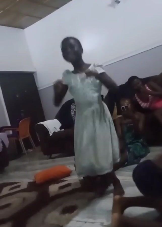 Inside a house, a young girl in a light-colored dress is dancing in front of several people
