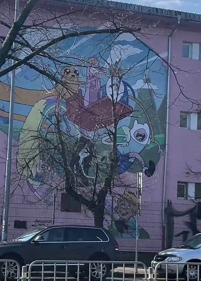 n outdoor shot of a large mural painted on the side of a building. The mural features cartoon characters, including one that appears to be falling. A bare tree is in the foreground, partially obscuring the mural. A street runs in front of the building, with cars passing. A metal fence separates the street from a grassy area. The building is pink and has windows. The sky is blue with some clouds. The lighting suggests it is daytime.