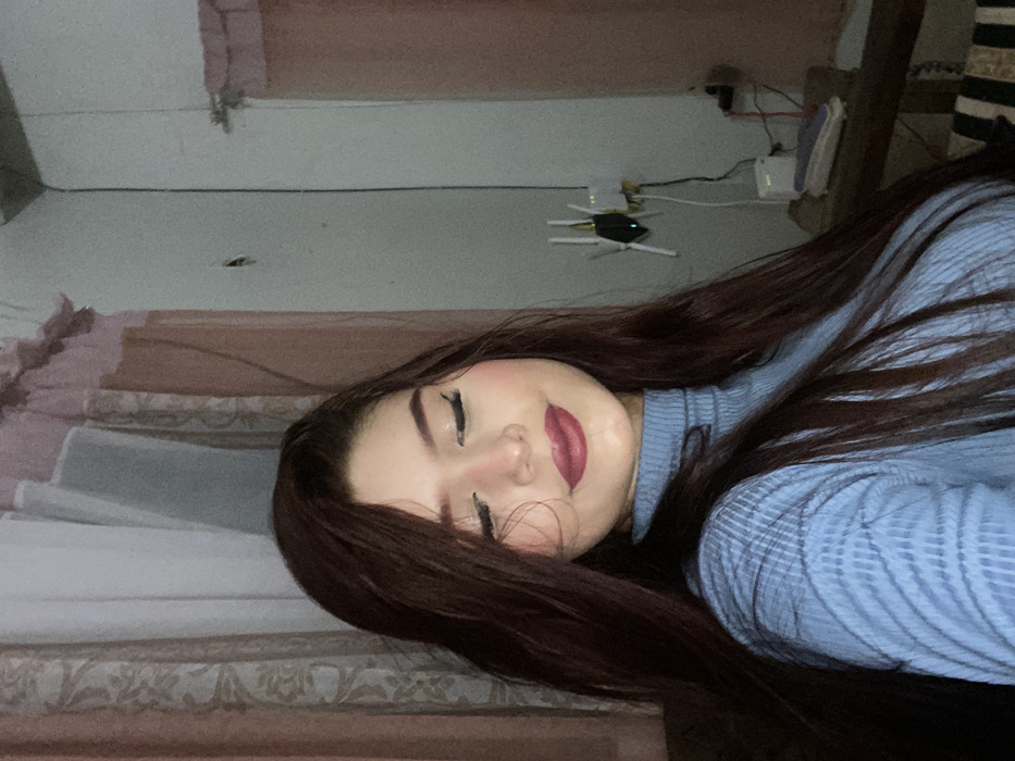 This image depicts a young female indoors, in an unspecified residential setting within Juan Griego, Venezuela. The female, centered in the frame, has long, dark brown hair and fair skin. She wears a light blue ribbed turtleneck sweater. Her eyes are cast downwards, appearing closed, with visible dark eyeliner and dark pink lipstick. Her head is slightly tilted to her right. The background on the left features two layers of curtains: an inner sheer white layer and an outer patterned light-toned layer, possibly pinkish-brown. The background on the right consists of a light-colored wall with a visible corner. A dark-colored networking device with multiple white antennas, likely a Wi-Fi router or signal booster, is mounted to this wall. Below it, a white wall outlet is visible with a cable connected to the device. A small, dark indentation or mark is present on the wall above the networking device. Further down, on a dark wooden surface, consistent with a piece of furniture, a light-colored object, possibly a phone or remote control, is present. Partial view of what appears to be a dark-colored cushioned furniture item is visible in the lower left foreground. The scene is illuminated by ambient light, with some direct light source illuminating the subject's face.