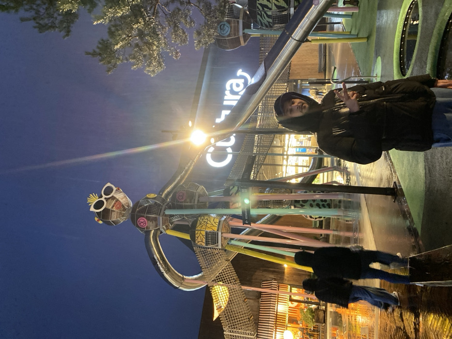 A vertical shot shows a person wearing a dark jacket and hood, flashing a peace sign. The person stands next to a colorful structure featuring a figure with oversized sunglasses. A large sign with the word "Conuray" is visible in the background. The sky is a deep blue, suggesting it is evening or nighttime. The ground appears wet, possibly from rain. Two more people are seen in the distance standing near the structure.
