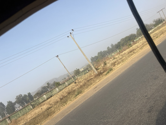 A tilted view shows a road under a bright sky, lined with dry grass and vegetation. Utility poles with wires stand along the roadside. A long, low wall runs parallel to the road, with trees behind it. A small mountain is visible in the distance. A portion of a vehicle's frame appears in the foreground, partially obscuring the view.