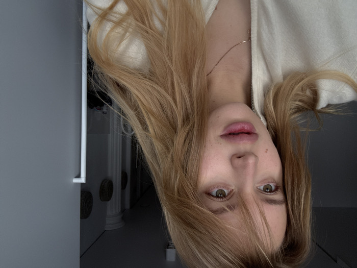 An indoor, close-up image depicts a female individual, approximately 20-30 years of age, with fair skin, light-colored (blonde to light brown) long hair styled with bangs