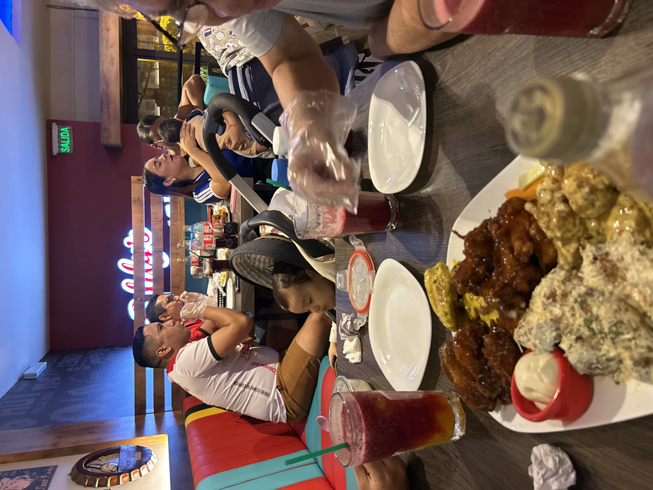 A group of people, including a baby in a stroller, are seated at a table enjoying a meal at a restaurant. They wear plastic gloves, and plates are filled with various types of chicken wings and dips. Glasses of blended drinks sit beside the plates. A sign on the wall says "Salida," and there are Coca-Cola bottles on the table. The seating area features colorful seating and decor.