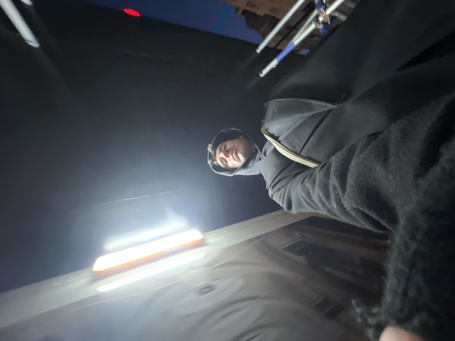 A man wearing a black hooded jacket is facing the camera from a low angle. A bright, horizontal light fixture is below the man, illuminating the scene. A dark night sky is visible above him. The background is blurry, suggesting movement. The composition is tilted, adding a sense of dynamism and the photo's subject seems to be indoors. The man has a relaxed expression.