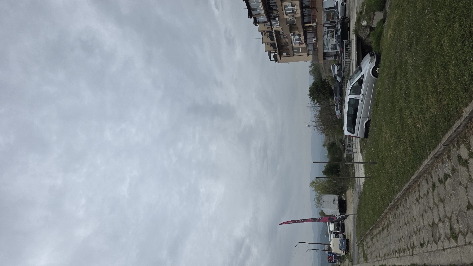 street scene in Blagoevgrad, Bulgaria. A multi-story building stands adjacent to a parking area filled with cars and a silver van. A grassy slope runs alongside the street, separated by a concrete barrier. The sky is overcast with grey clouds. A tall advertising banner is on the lower left side of the road.