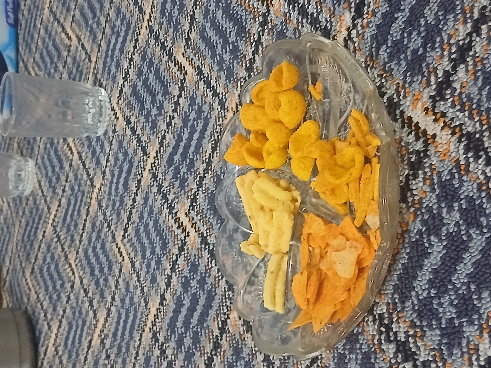 The image portrays an indoor scene in Quetta, Pakistan, featuring an assortment of snacks and drinkware. A clear, segmented dish, divided into four compartments, occupies the foreground. The upper-left segment contains light yellow, cylindrical extruded snacks. The upper-right segment holds bright orange, cup-shaped extruded snacks. The lower-left segment contains flat, irregularly shaped orange chips. The lower-right segment contains bright yellow, elongated, irregularly shaped extruded snacks. Two clear, empty drinking glasses with textured surfaces are visible in the midground, positioned behind the snack dish. All items rest on a textile surface, likely a carpet or rug, characterized by a wavy, horizontal striped pattern in shades of blue, grey, white, and orange. A partially obscured light blue and white object is discernible in the upper-right background. No individuals are present in the frame, and no active interactions are depicted.