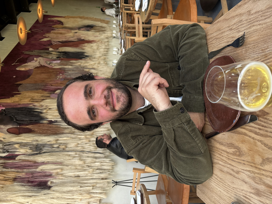 A man with dark hair and a beard sits at a wooden table, smiling at the camera. He wears a green corduroy shirt. A glass of beer sits on a brown plate next to him, along with a fork and a knife. Other people are visible in the background. A large, textured wall hanging with earth tones adorns the wall. The lighting is warm, and several circular light fixtures are visible on the ceiling.