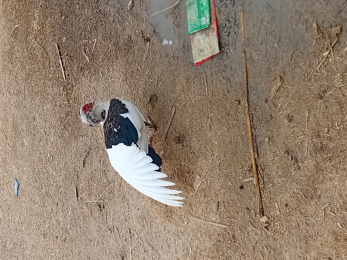 A Muscovy duck is positioned on dirt ground. Its head is gray and red, blending into its white body with black markings on its back and wing. The wing is outstretched, displaying white feathers. Dried grass and dirt surround the duck. In the upper right corner, a piece of trash is visible near a puddle. A thin brown stick lies diagonally across the ground.