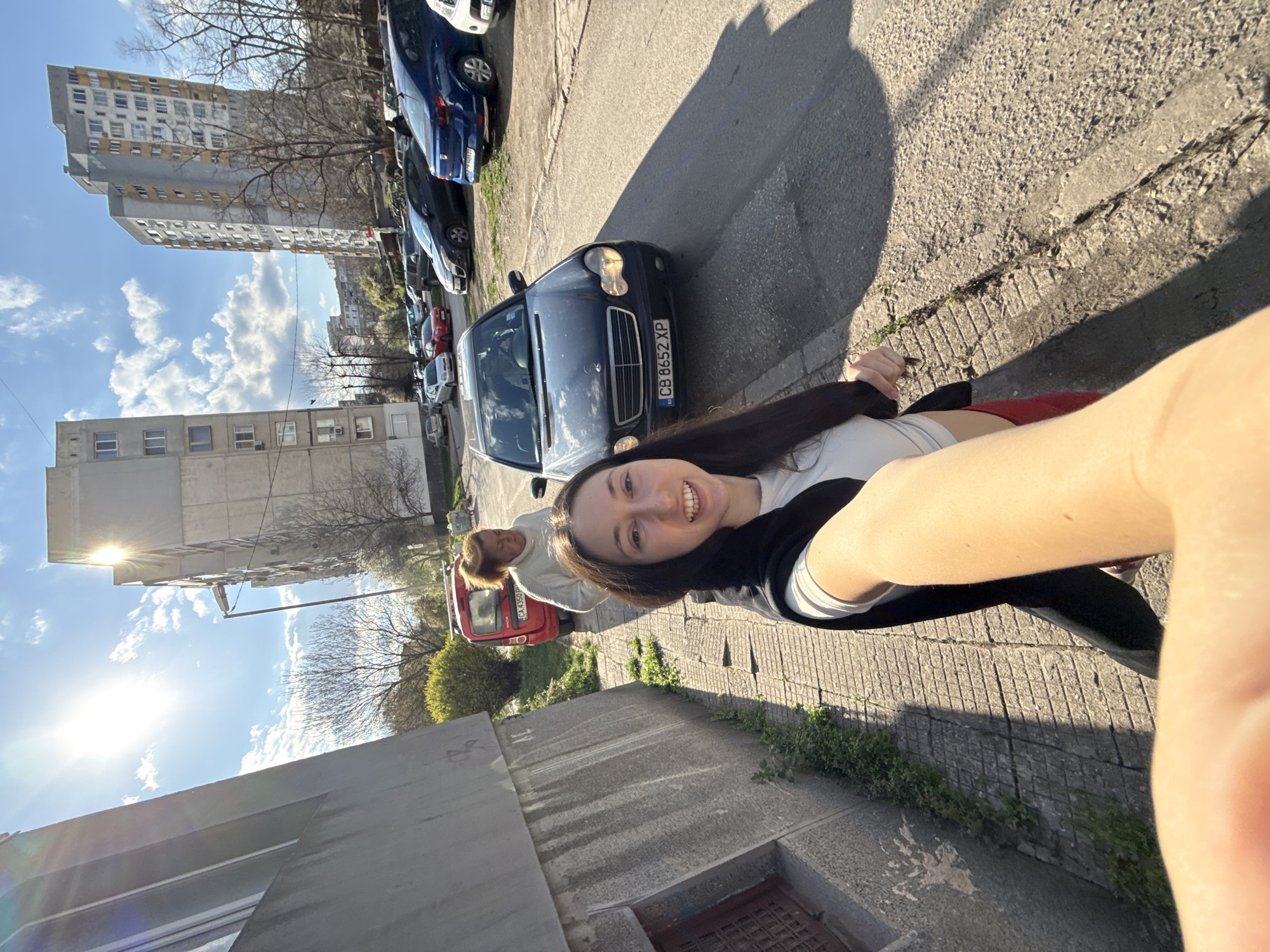A daytime selfie shows two individuals in Sofia, Bulgaria
