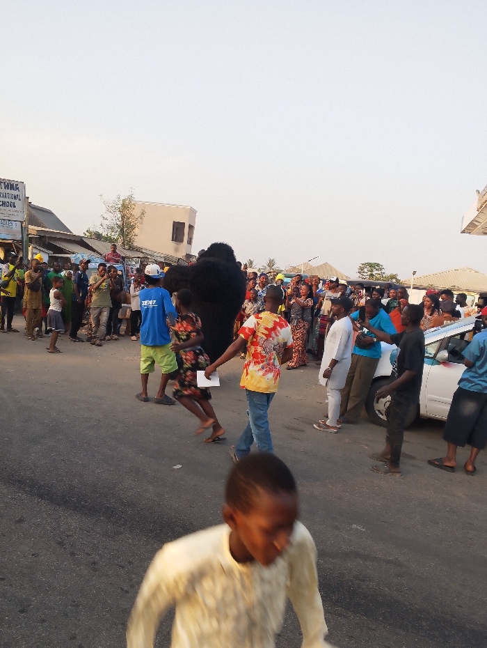 A daylight scene unfolds on a paved street in Zango-ndaji, Nigeria, featuring a crowded public gathering