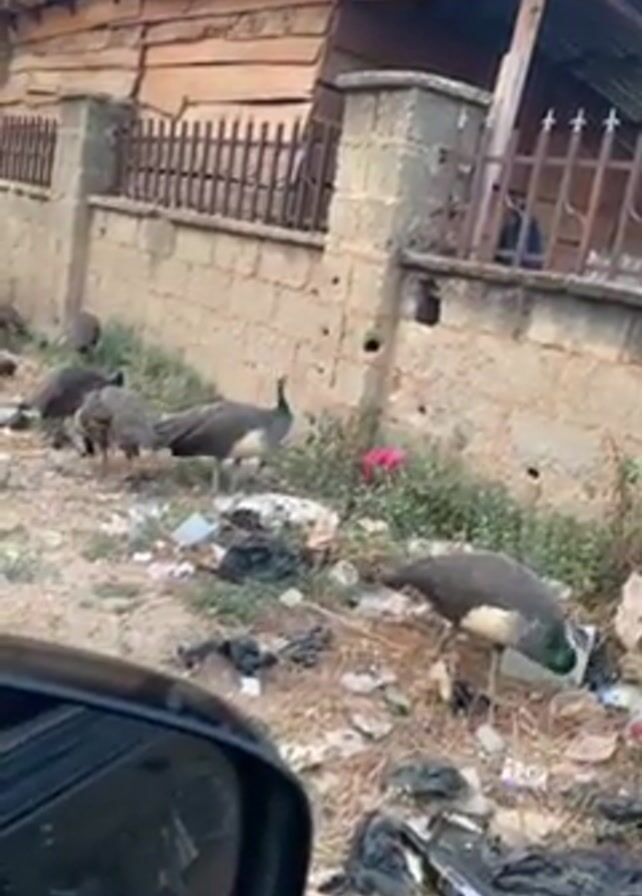 group of peacocks foraging in a littered area alongside a street. The scene is viewed from inside a car, with the side mirror visible in the foreground. The background includes a building with a fence, and the ground is covered in trash and sparse vegetation. The peacocks are varying shades of gray and green. They are pecking at the ground, presumably searching for food. The overall environment appears to be urban or suburban and somewhat unkempt due to the presence of litter.