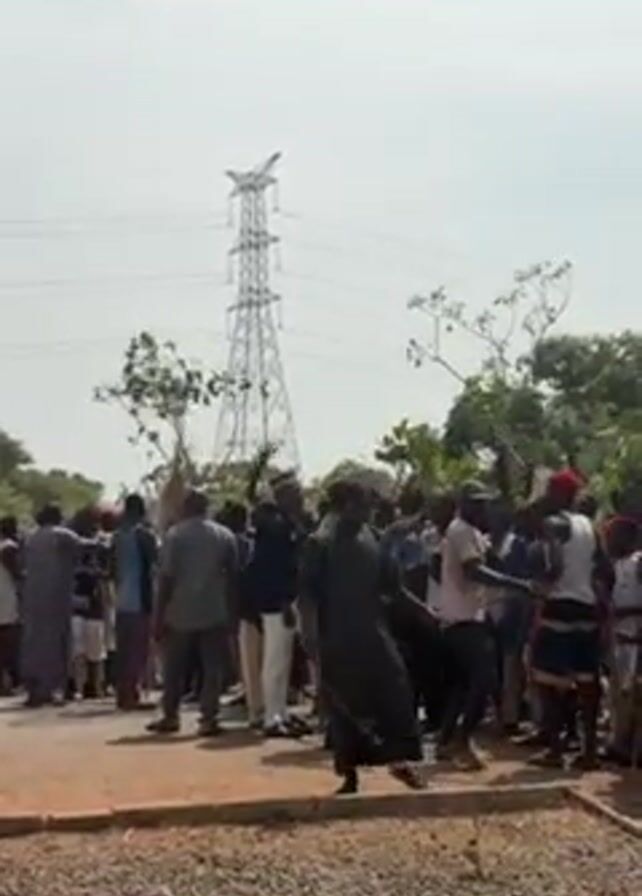 A medium shot captures a diverse group of individuals gathered along a roadside. The crowd is a mix of ages, with some members holding sticks. A person in military attire stands among them. A high-tension electrical tower rises prominently in the background. The scene is set in a slightly rugged environment, and the sky is overcast, casting a flat light over the entire area.