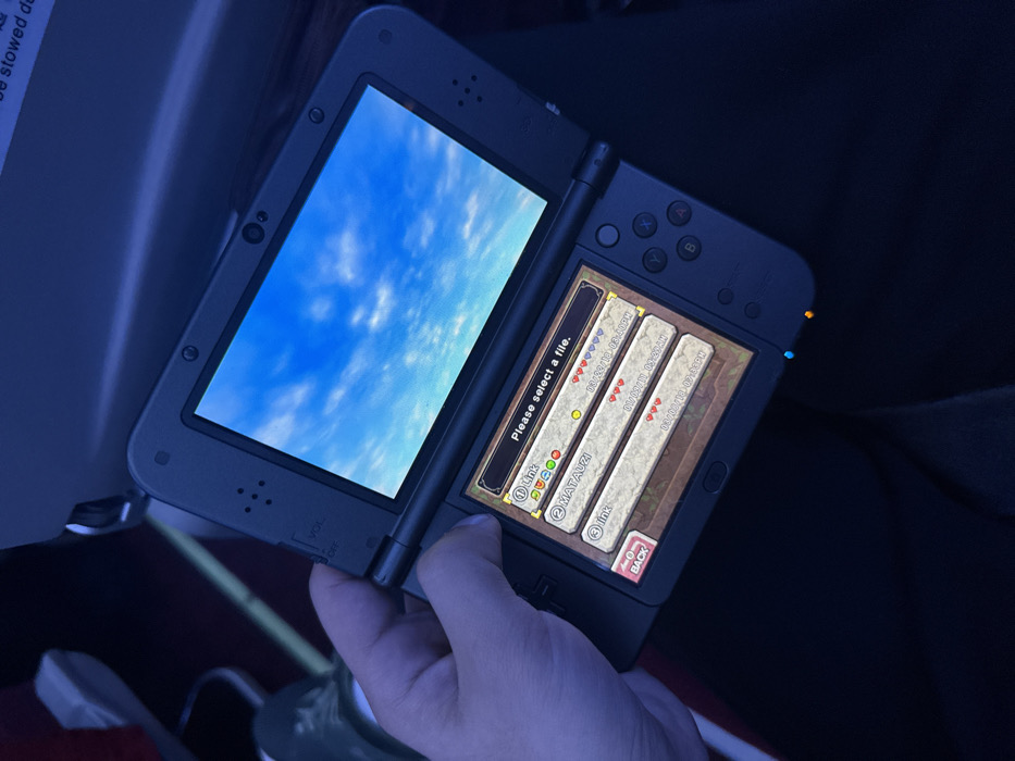 The scene depicts a person's left hand holding an opened dark gray Nintendo 3DS XL handheld console inside an airplane cabin
