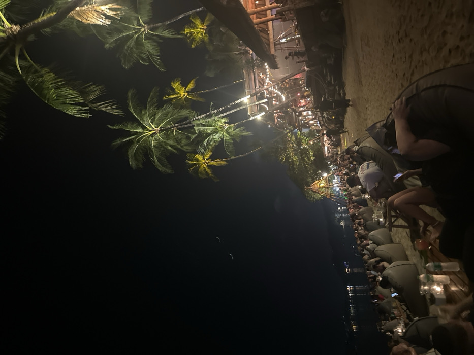 The image presents a nighttime scene on a sandy beach located in Baan Bo Phut, Thailand. The dark sky occupies the upper-left quadrant, featuring two faint, horizontally aligned, crescent-shaped lights. Tall palm trees, illuminated by artificial yellow and white lights, are prominent on the right side of the frame and extend along the beach. On the right, a multi-level wooden structure with a thatched roof is visible, adorned with numerous string lights. This structure appears to be a commercial establishment, possibly a bar or restaurant, with several individuals moving within and around it. Further along the beach to the left, a conical, teepee-like wooden structure with internal lighting stands on the sand. The foreground and midground are populated by dozens of individuals seated on dark grey beanbag chairs arranged in rows facing a body of water to the left. Small, low wooden tables are positioned between these beanbag chairs, holding various beverages in glasses and bottles, along with other small objects. Visible individuals are mostly sedentary, some interacting with mobile devices. Distant lights are observable across the water on the left horizon, indicating either boats or a far shoreline. The scene is illuminated entirely by artificial light sources.