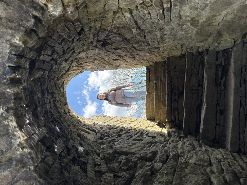 The image captures a single female subject standing at the top of a stone staircase, framed by the illuminated exit of a darkened, arched stone passage. This structure is consistent with historical ruins such as those found at Blankenstein Castle (Burg Blankenstein) in Hattingen, Germany. The female, possessing medium-length dark hair, is dressed in a light brown puffer-style jacket, light blue jeans, and light-colored shoes. She is positioned facing the viewer, with a slight smile, hands resting at her sides. The immediate environment consists of a rough-hewn stone tunnel or archway and a series of uneven, irregular stone steps ascending towards the exterior opening. The interior of the passage and the lower steps are largely in shadow, while the upper steps and the female figure are brightly illuminated by natural light entering from the archway. The background visible through the archway consists of a blue sky with scattered white clouds. The bare branches of deciduous trees are visible against the sky, suggesting a leafless season. No other individuals or significant objects are present in the scene.
