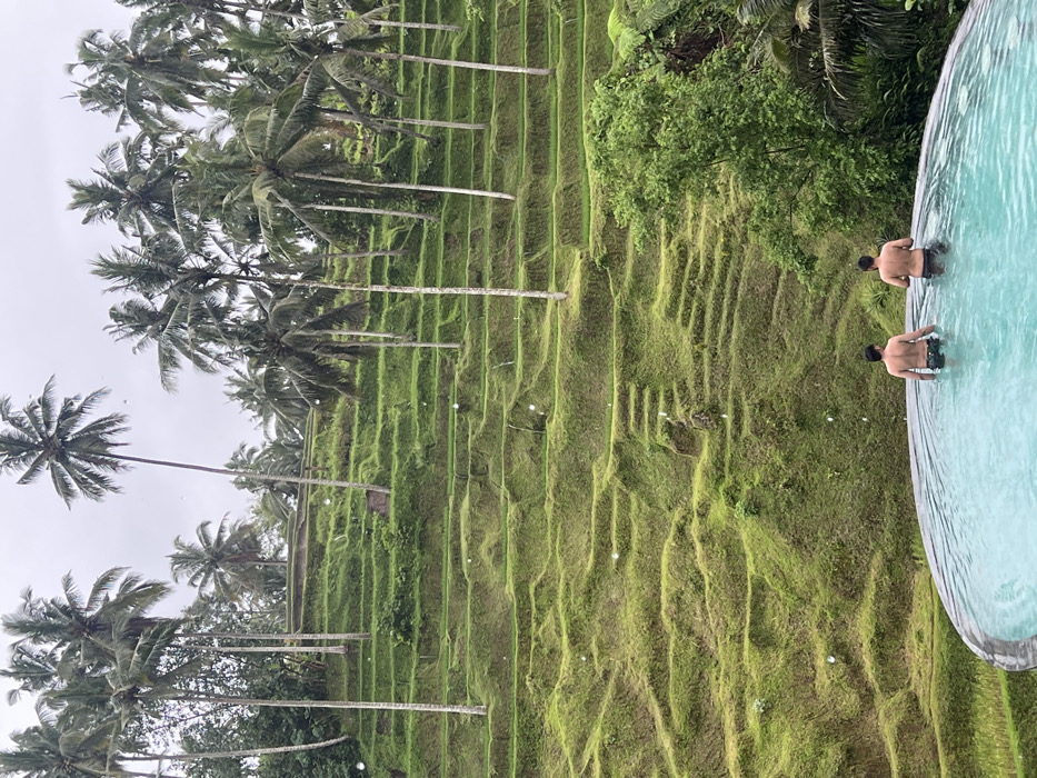 The image depicts an outdoor scene in Tegal Suci, Indonesia, featuring a terraced agricultural landscape and an infinity pool under an overcast sky. In the foreground, two adult males are partially submerged in the light blue water of a curved infinity pool, viewed from behind. Both are wearing dark swim trunks and are positioned with their backs to the camera, facing the terraced hillside. The background is dominated by extensive, vibrant green agricultural terraces, likely rice paddies, ascending a steep slope. Numerous tall palm trees are interspersed among these terraces and along the upper ridges. A patch of dense green foliage is visible on the right side of the midground, below the terraces. Small, scattered white specks, possibly raindrops, are present throughout the frame.