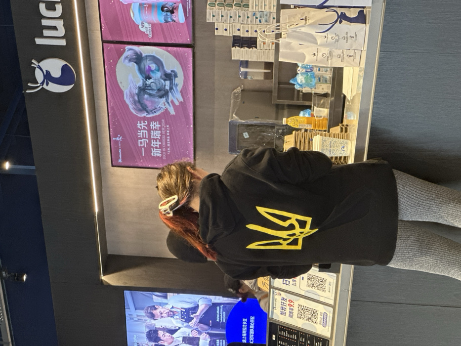 The scene depicts the interior of a Luckin Coffee establishment in Yiwu, China. A person, observed from behind, stands at a dark grey counter. The individual wears a black hooded sweatshirt with a prominent yellow Ukrainian trident (Tryzub) emblem centrally displayed on the back. Their hair, which appears to be light brown with reddish undertones, is pulled back and secured with a white claw clip. Below the hoodie, they wear grey, ribbed leggings or pants. On the polished dark grey counter in front of the person, a Luckin Coffee branded paper cup with a lid is present. To the right, various items are visible: stacks of white paper bags with the Luckin Coffee deer logo, numerous stacked paper cups, and a yellow bottle, likely containing a beverage. Above the counter, digital screens serve as advertisements. The screen on the left shows two men, one Asian and one Caucasian, in what appears to be a coffee-making setting, with visible English text "AmberLattes" and Chinese characters. The screen to the right displays a pink-themed advertisement featuring stylized horses or mythical creatures, with Chinese text translating to "Take the lead, New Year Luck" (一马当先 新年瑞幸). A white stand with two QR codes and Chinese text, including "加我好友" (Add me as a friend) and "扫码" (Scan code), is visible on the left side of the counter. The walls are dark grey, illuminated by linear strip lighting and recessed spotlights.
