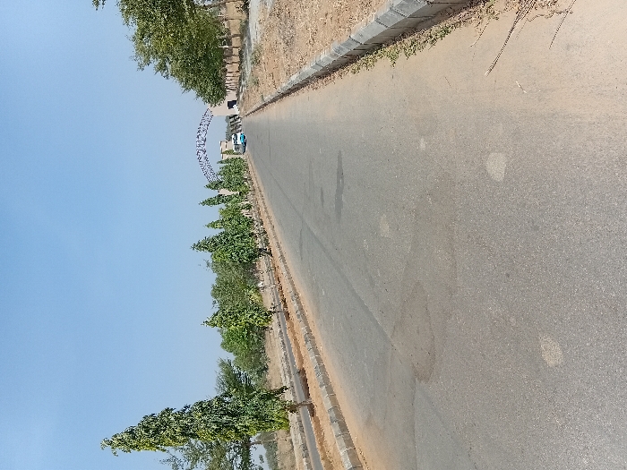 The scene depicts a straight asphalt road extending into the distance under a clear blue sky, located in Ayama, Nigeria. The road surface is gray with several lighter, irregularly shaped patches. Concrete curbs define both edges of the road. To the left of the road, a uniform row of approximately ten tall, slender evergreen trees with dense green foliage stands in dry, unpaved terrain. Further left, beyond these trees, the landscape consists of sparse, lighter green vegetation and bare, dry earth. To the right of the road, the ground is predominantly bare, dry soil with sporadic small green plants and a few larger, more distant trees. In the mid-distance, a light blue vehicle, resembling a bus or large van, is visible on the road, positioned centrally and moving towards a large archway. The archway, spanning the width of the road, features a dark, patterned, possibly metallic upper structure and lighter-colored support pillars on either side. Beyond the archway, additional indistinct structures and trees are visible. No individuals are present in the visible area.