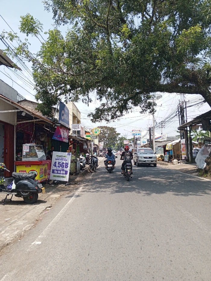 The scene depicts a street view on a clear day, with sunlight casting shadows. The visual evidence, including signage displaying "Rp" currency and Indonesian language (e.g., "AYAM BAKAR," "Adalah Setiap Hari"), places this location in Indonesia. The asphalt road, marked with a white line on its left edge, extends into the background. A large tree with dense green foliage overhangs the left side of the street, its branches extending across the road, casting dappled shadows. Overhead, numerous utility wires are visible against the sky. On the left side of the street, a narrow concrete sidewalk runs alongside a row of commercial establishments. In the foreground, a black Vespa scooter is parked on the sidewalk, facing left. Next to it, a red and yellow street vendor cart with a glass display case is present, displaying "AYAM BAKAR" text. A white rectangular sign advertises a "4.5GB" data plan for "Rp 14.000." Further down, a building features "EMMA SALON" signage, and several motorcycles are parked along the sidewalk. On the right side of the street, a less defined shoulder leads to a utility pole and various small structures, some with corrugated metal elements. Two individuals on motorcycles are traveling towards the camera in the right lane. The lead rider wears a red helmet and dark clothing on a dark motorcycle. The second rider, also on a dark motorcycle, wears a blue top and a helmet. A silver SUV is visible further down the street, also moving towards the camera.