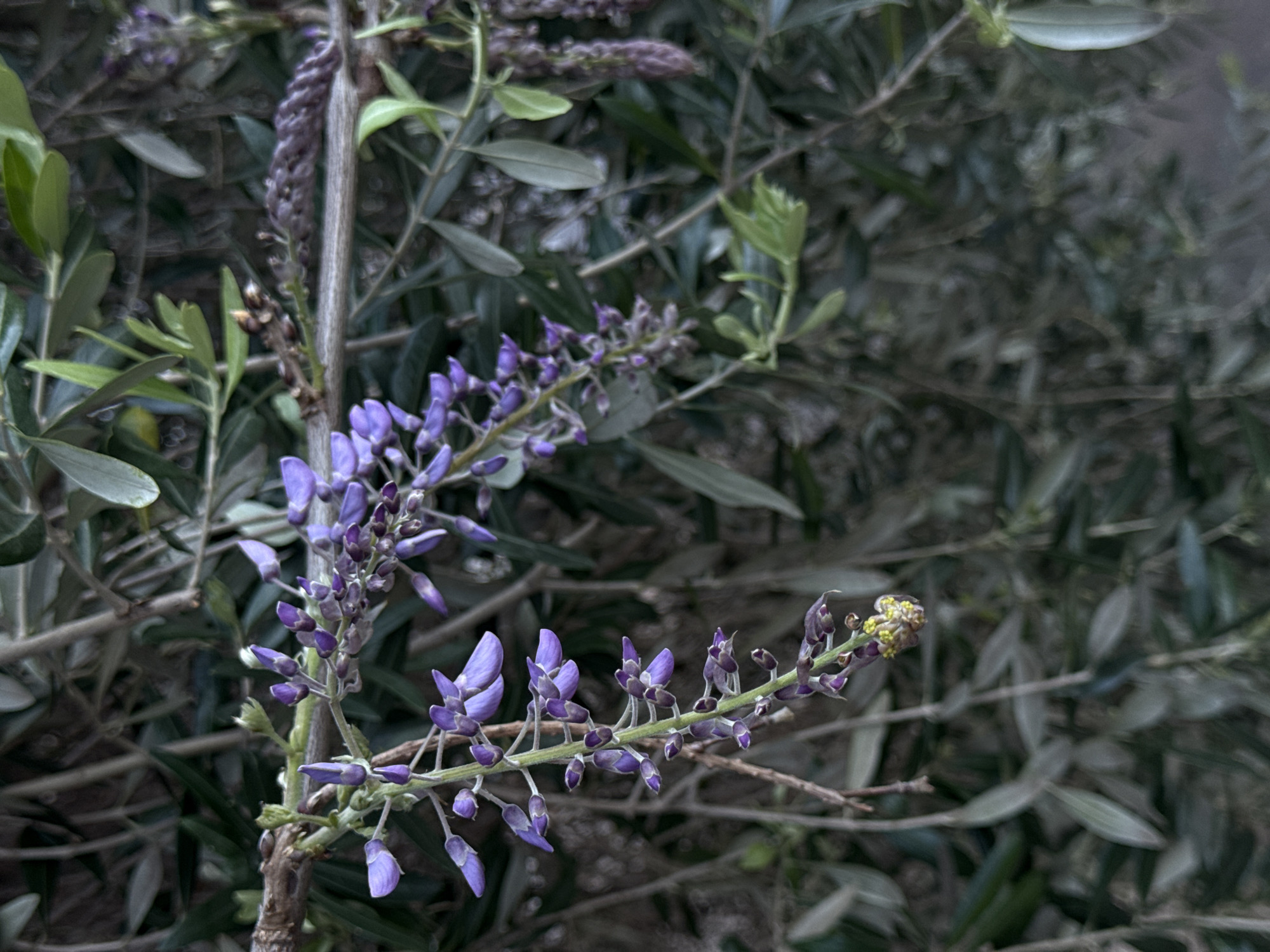 This image shows a close-up view of a blooming wisteria vine in Budva, Montenegro