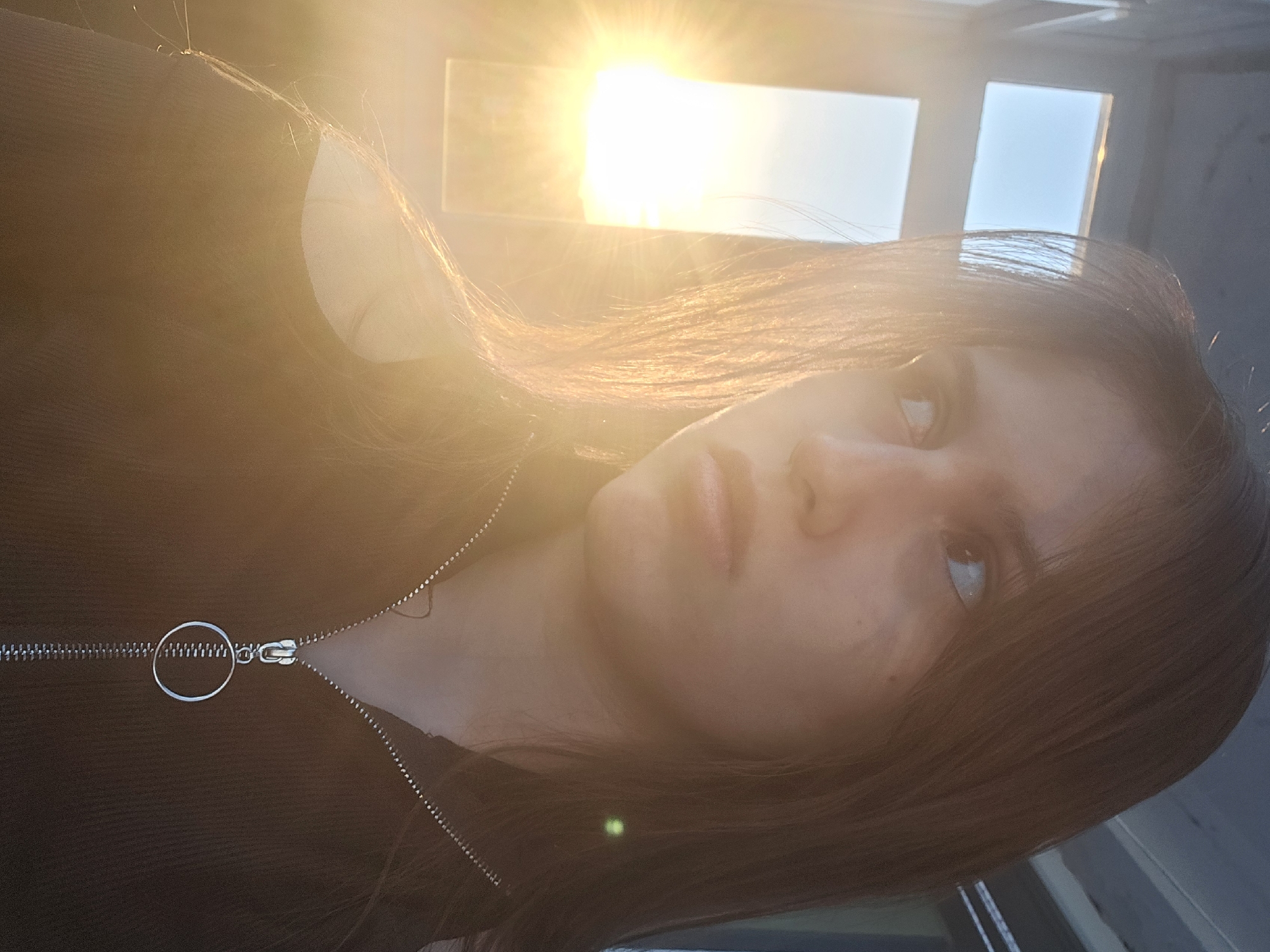 The image is a selfie of a person with light skin and brown hair, likely taken indoors with bright sunlight filtering through a window. The person is wearing a dark-colored zippered top. The window is visible in the background with bright light. The location is likely NOT Burgas, Bulgaria, as there is no information to support this claim.