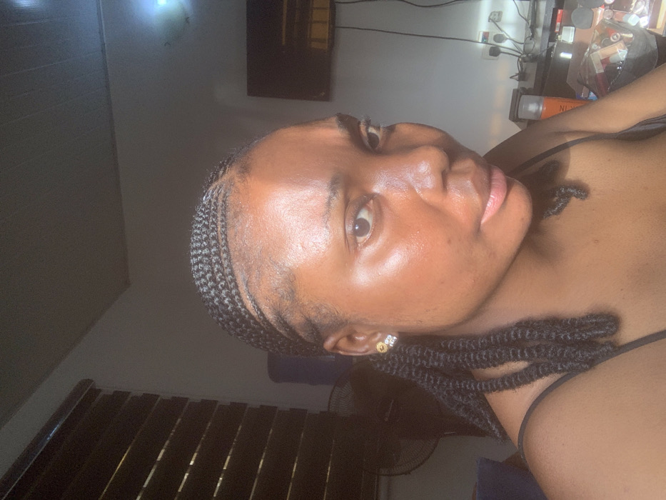 A forensic examination of the image reveals an adult female captured in a medium-shot portrait within an indoor environment in Abuja, Nigeria. The subject, exhibiting a dark complexion, has cornrow braids styled from her forehead, with textured extensions resting over her left shoulder. She wears small, circular stud earrings with a yellow and white design. Her gaze is directed towards the viewer. She is clad in a dark, likely black, spaghetti-strap top. Natural light appears to emanate from the left, casting highlights on her face and shoulder. The background elements are consistent with a residential interior. To the upper left, dark horizontal window blinds are visible. A black, standing oscillating fan is partially obscured behind the subject on the left. A wall-mounted flat-screen television is positioned on the right, below which a white multi-socket power outlet and associated electrical wiring are visible. On a dark surface in the lower right foreground, an orange aerosol can stands beside a clear container holding various cosmetic items, including tubes and brushes. The ceiling is a light color, and the walls appear to be a neutral tone.