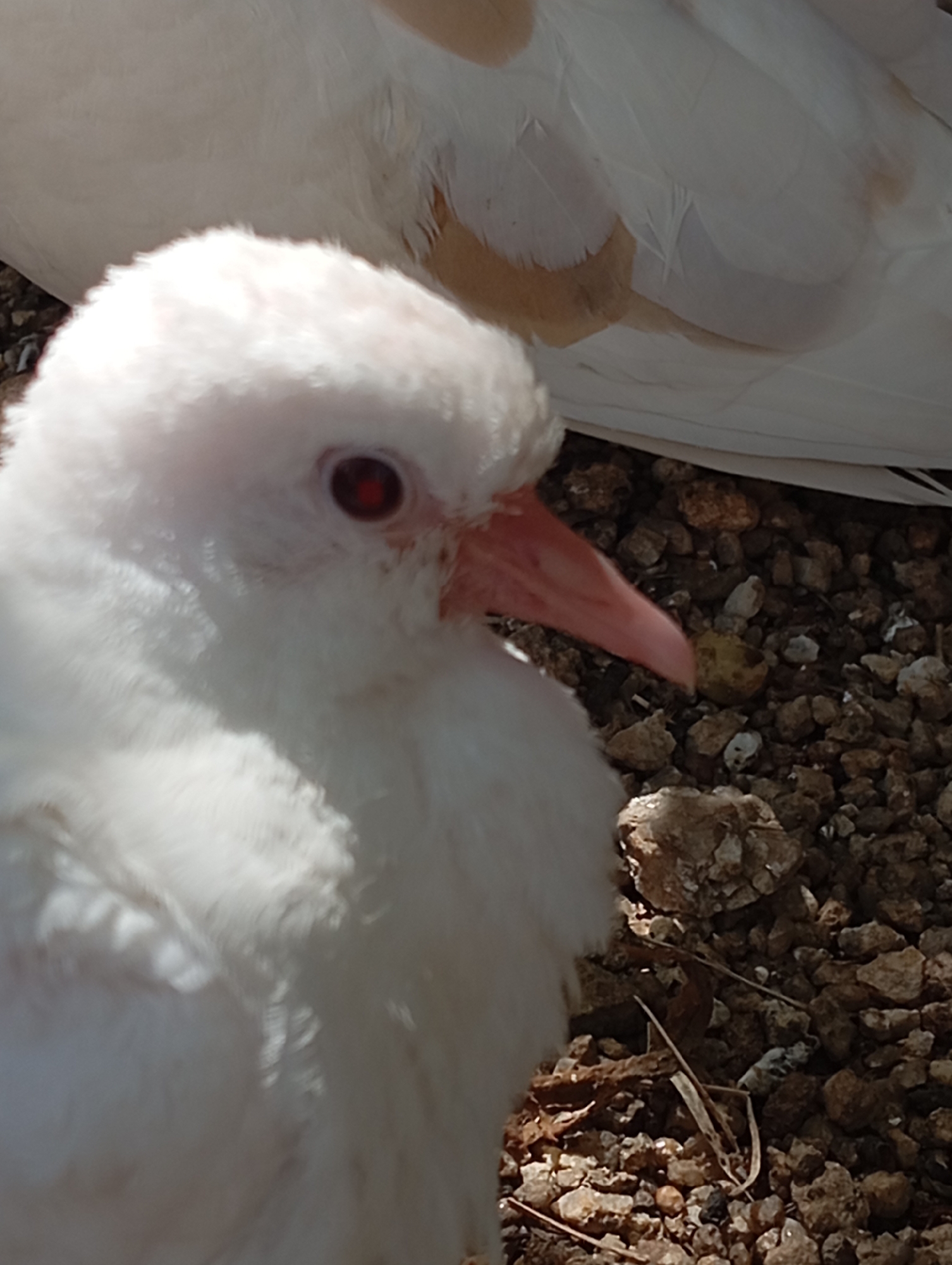 A white pigeon stands amidst small rocks and debris. The pigeon has red eyes and a pink beak. The background is blurred, but appears to contain more of the same type of ground cover and another pigeon. There is no information about the city of Lassan, Pakistan in the image.