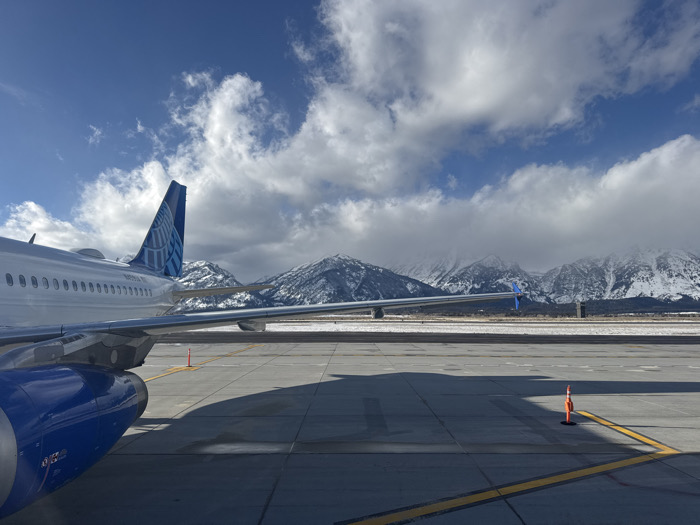 - "A partial view of a United Airlines plane on an airport tarmac with snow-capped mountains in the background" by FM-BS4Ql2, licensed under CC BY 4.0